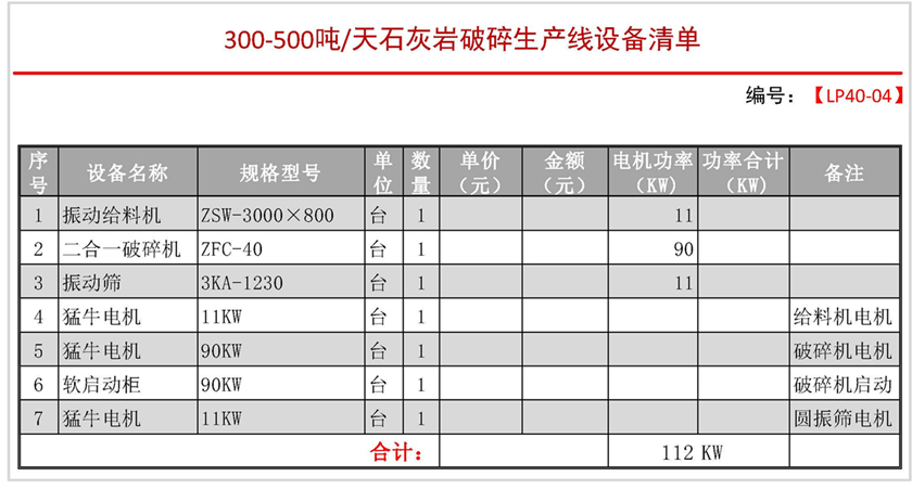 導讀:日產300-500噸配置方案四【最大進料】:≤500mm 【生產能力】:30-50t/h【裝機功率】:112KW 【適用物料】:石灰石【出料規格】:(1)0-8mm (2)8-15mm (3)15-40mm【方案優勢】:1.投資小2.省電3.能破大料4.配件損耗低 我廠專業生產制砂設備生產線20余年,公司目前有3個廠在昆明…